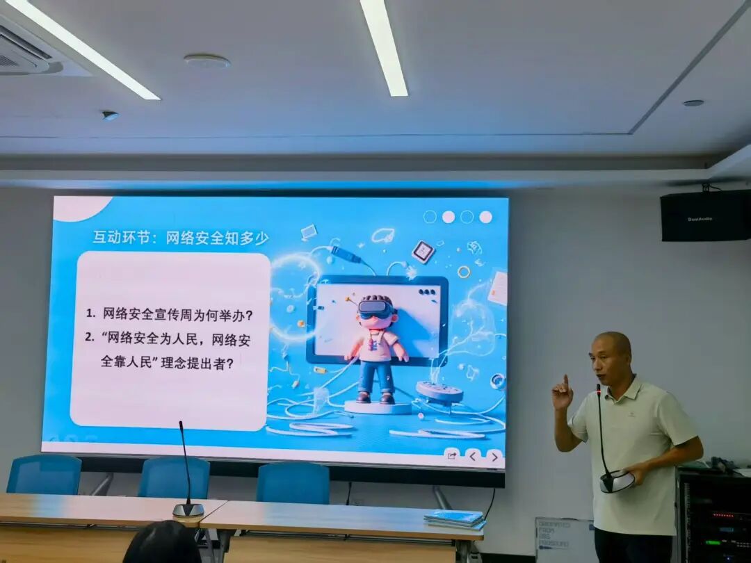 讲座以充满趣味的有奖问答环节拉开帷幕,瞬间点燃了现场氛围。同学们踊跃参与、积极应答,在轻松愉快的互动中激发了对网络安全知识的浓厚兴趣。 随后,毕晓东围绕网络安全周的背景与意义展开讲解,让同学们明白在数字化、网络化深入发展的当下,网络安全已成为关乎个人权益、组织运行乃至国家安全的重要组成部分。他强调,网络安全宣传周不仅是全民安全教育的重要载体,更是推动构建安全、健康、清朗网络空间的战略举措。