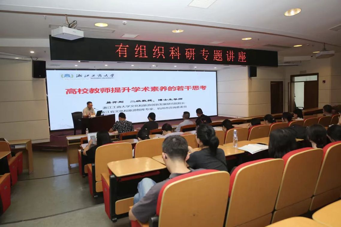 为有效提升教师科研能力与项目申报质量,9月16日下午,数字技术学院与智慧旅游学院在学校崇学行政楼三楼报告厅联合举办“高校教师提升学术素养的若干思考”专题讲座。讲座由浙江工商大学文化和旅游创新发展研究院院长、二级教授、博士生导师易开刚教授主讲,智慧旅游学院党总支书记、院长崔悦主持,我院全体教职工参加。