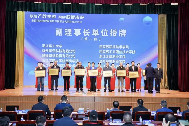 在全场嘉宾见证下,与会领导和嘉宾共同按下启动键,标志着全国供应链数智创新产教融合共同体正式成立。大会先后为杭州电子科技大学、新华三集团、浙江经济职业技术学院3家理事长单位,浙江理工大学、南京工业职业技术大学、浙江东讯文化集团有限公司等21家副理事长单位代表授牌。