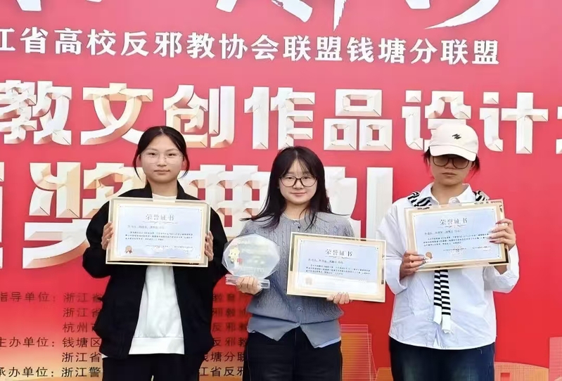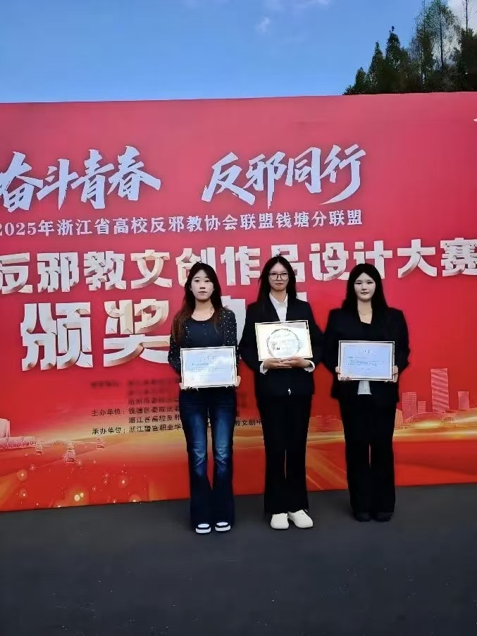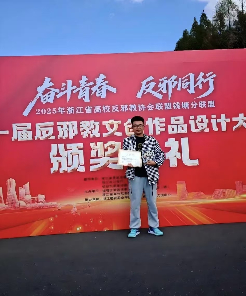 10月29日,我校反邪教协会组织师生代表赴浙江警官职业学院,参加“奋斗青春 反邪同行”2025年浙江省高校反邪教协会联盟钱塘分联盟第一届反邪教文创作品设计大赛颁奖典礼。我院学子凭借扎实创作功底与深刻主题表达斩获佳绩:海报绘本类作品荣获三等奖,短视频和动漫类作品摘得优秀奖!