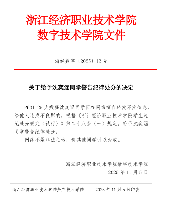 浙经数字〔2025〕12号:关于给予沈奕涵同学警告纪律处分的决定