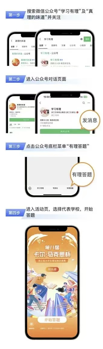 赛前练习于11月17日9:00—11月21日21:00在省理论发声总平台“学习有理”和“真理的味道”微信公众号上进行。每日23时30分至次日凌晨2时为系统维护时间,不能答题。参赛学生搜索关注“学习有理”和“真理的味道”微信公众号,注册、选择学校等信息。可通过点击页面互动栏“有理答题”按钮参与答题,或通过相关活动推文获取答题入口进行练习,练习次数不限,一次20题,满分100分。“学习有理”微信公众号将公开部分初赛题库。赛前练习期间遇到技术问题,可在9:00-22:00联系“学习有理”公众号后台。