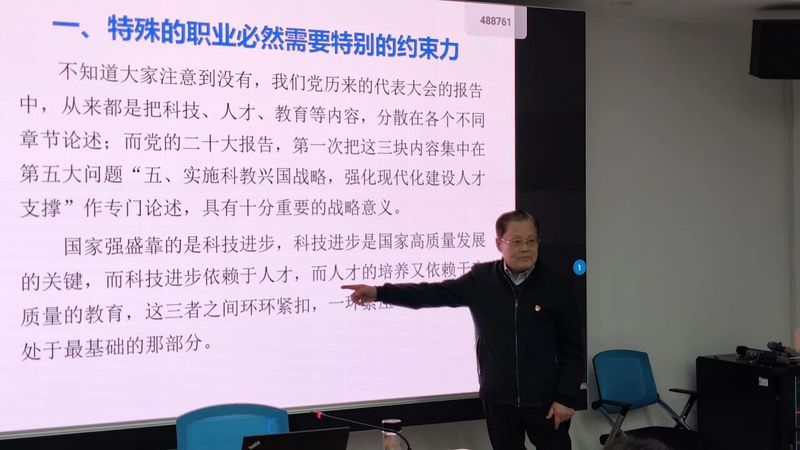 为深入贯彻落实立德树人根本任务,大力弘扬教育家精神,全面提升教师队伍思想政治素质与职业道德修养,11月18日,数字技术学院举办“涵养高尚师德,践行育人使命”师德师风专题活动,特邀杭州市萧山区关工委讲师团团长、浙江省“红船精神”宣讲团成员、省百佳老干部优秀宣讲员李凌峰作专题讲座。学院班子成员及全体教师参加学习。