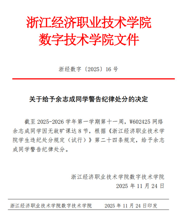 浙经数字〔2025〕16号:关于给予余志成同学警告纪律处分的决定