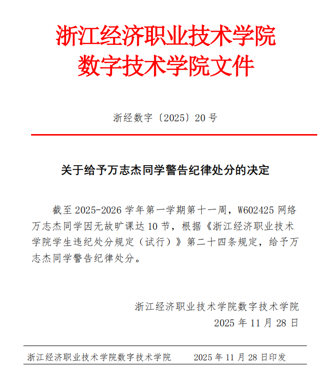 浙经数字〔2025〕20号:关于给予万志杰同学警告纪律处分的决定