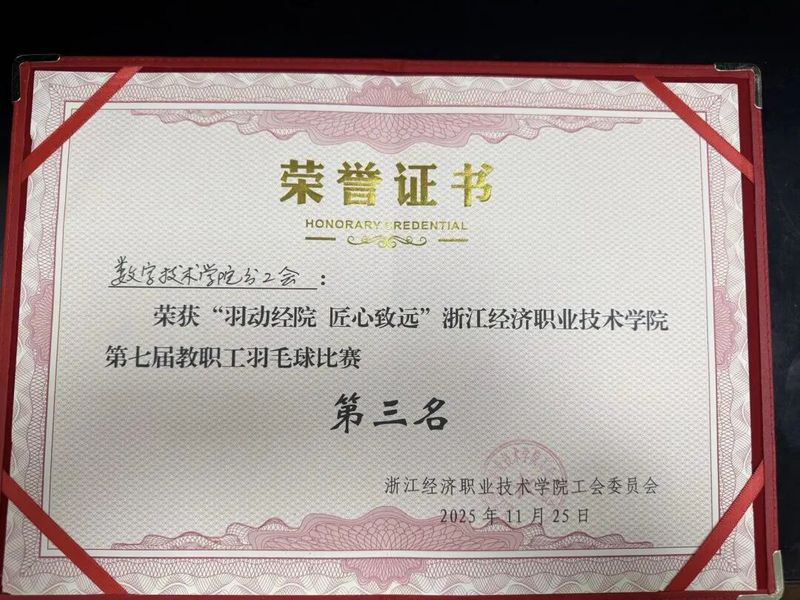 11月25日,浙江经济职业技术学院第七届教职工羽毛球比赛在学校体育馆落下帷幕。数字技术学院分工会教职工羽毛球队凭借过硬的竞技水平、默契的团队配合与坚韧的拼搏精神,在全校12支参赛队伍中一路过关斩将,最终斩获季军,为学院赢得荣誉。