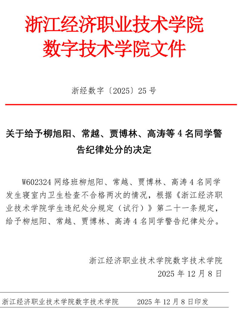 关于给予柳旭阳、常越、贾博林、高涛等 4 名同学警告纪律处分的决定