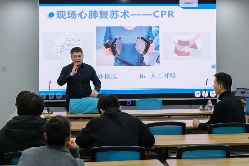讲座现场,拥有13年健康宣教经验的周方军讲师,以幽默风趣的语言结合真实案例,深入浅出地解析各类健康热点问题。他着重强调了心脏骤停后“黄金4分钟”的救援紧迫性,系统讲解了CPR(心肺复苏)、海姆立克急救法及AED(自动体外除颤器)的适用场景与核心操作流程。为帮助教职工精准掌握技能,他借助专业教具进行现场实操演示,从胸外按压的力度、频率,到海姆立克急救法的手势发力点,再到AED电极片的粘贴位置与操作步骤,每一个关键环节都讲解细致、演示规范。