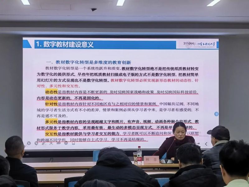 为响应职业教育数字化转型号召,破解 “双高” 专业群建设核心任务中的教材难题,明确数字化教材开发方向与路径,1月6日,数字技术学院举办数字化教材开发专题教研讲座。讲座特邀杭州电子科技大学教务处处长、浙江省教学名师、全国首届教材建设先进集体负责人林菲教授主讲,讲座由学院副院长毕晓东主持,全体教师参会学习。