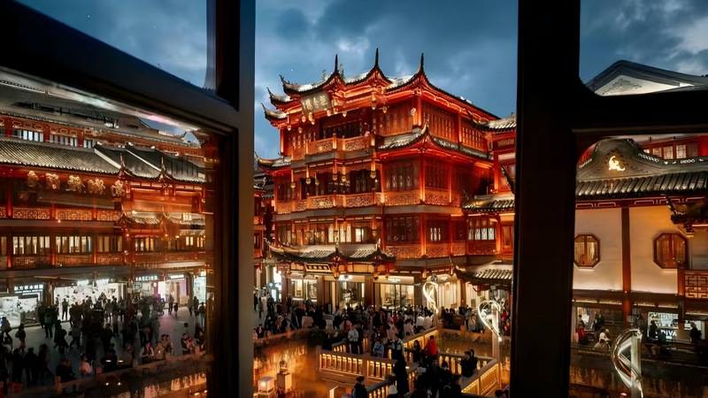 透过窗棂望去,豫园的夜色美得像一场温柔的旧梦。朱红的楼阁在暮色中舒展,飞檐翘角缀着暖黄的灯,雕花的廊柱间流淌着市井的热闹。攒动的人影伴着街巷的灯火,勾勒出最鲜活的年味。窗内是静谧的一隅,窗外是喧腾的人间,这份动静相融的美好,恰是新年最动人的模样。愿你在这古色古香的烟火里,寻得一份心安,三餐四季有滋味,岁岁年年皆顺遂。