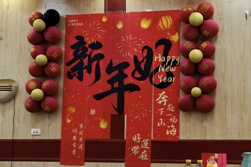 红纸黑字的“新年好”撞入眼帘,烫金烟火纹在暖光下闪着细碎的光。两侧气球簇着“福”字,将年味揉进红与金的配色里。“奔赴下一场山海”的题字,既有辞旧的洒脱,也有迎新的热忱。这一隅布置,是刻在骨子里的中式浪漫,愿新岁好运常在,岁月并逢,我们带着热爱,奔赴更远的山海。