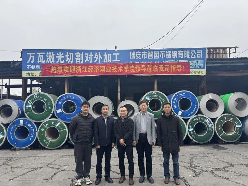 随后,学校老师们来到瑞安市智国不锈钢有限公司。05届计算机技术与应用专业校友薛悌国热情接待了母校老师。在薛悌国的陪同下,学校老师们深入加工车间,实地考察了其工厂核心业务的生产线,详细了解不锈钢卷材仓储、精密加工流程及市场应用情况。随后的座谈中,双方就传统制造业的数字化转型路径和人才培养需求进行了深入探讨。叶林良委员对薛悌国校友深耕实业、专注创新的精神给予高度评价。