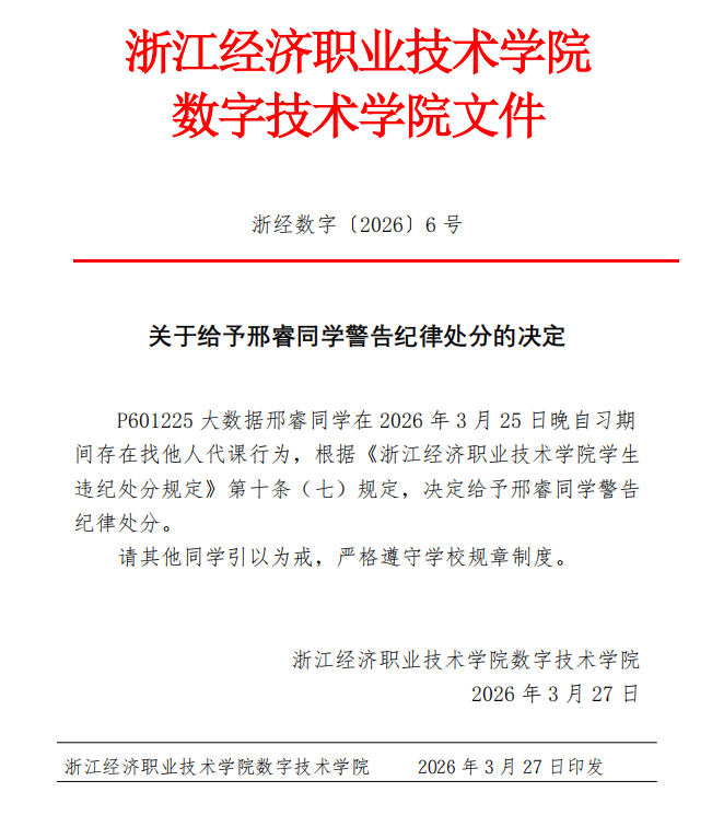 浙经数字〔2026〕6号:关于给予邢睿同学警告纪律处分的决定