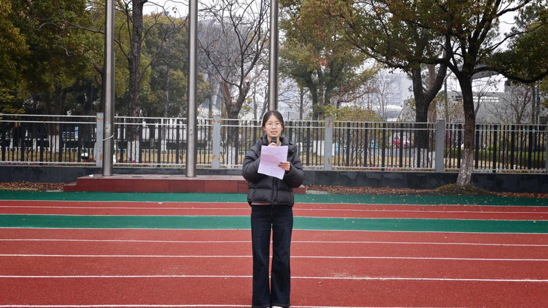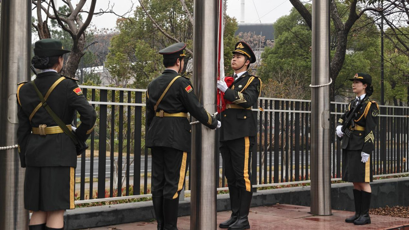 国旗护卫队迈着铿锵步伐,将五星红旗护送至升旗台。国歌激昂奏响,旗帜迎风升起,全体师生肃然而立,高唱国歌,行注目礼。