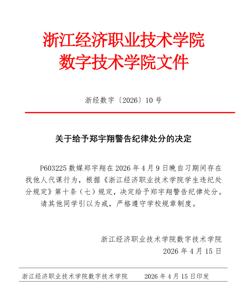 浙经数字〔2026〕10号:关于给郑宇翔同学警告纪律处分的决定